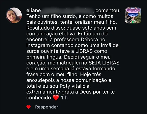 Eliane, Mãe "Finalmente consigo me comunicar com meu filho, após 7 anos sem comunicação efetiva!" RESULTADO: Reconexão Familiar